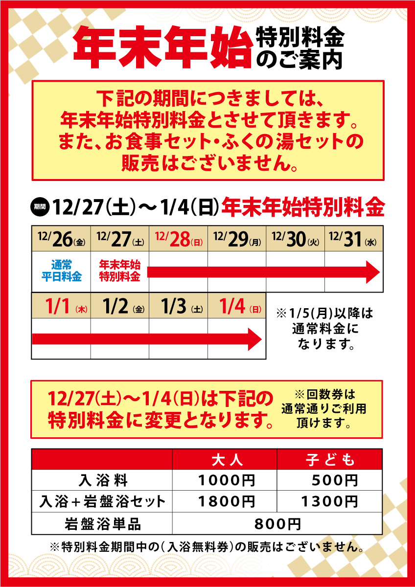 9:00~翌3:00 (最終受付 翌2:30 / 入浴 翌2:50) |